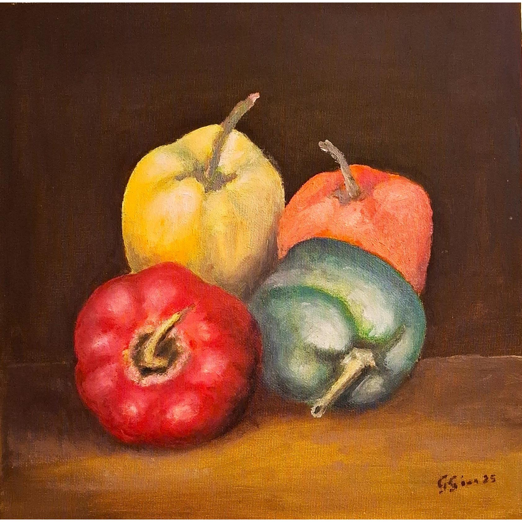 Natura morta con quattro peperoni di vario colore