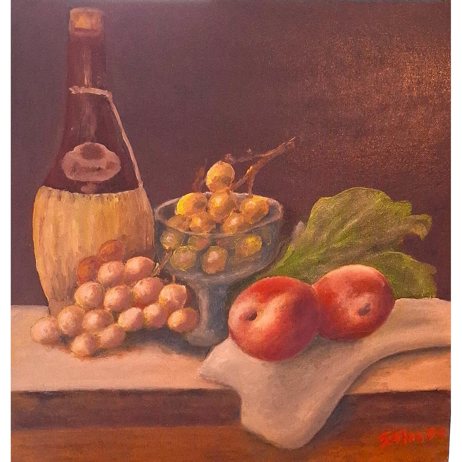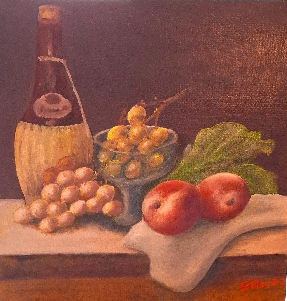 Natura morta con uva, pesche e un fiasco di Chianti su tavolo rustico.