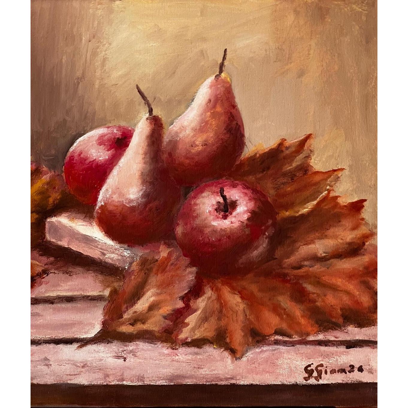 Visione autunnale con pere, mele e foglie.
